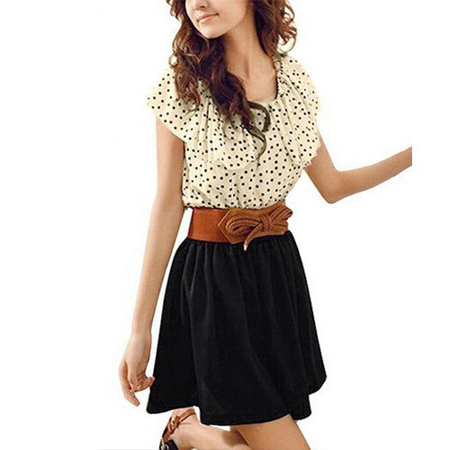 Allegra K Women Dots Print Flouncing Patchwork Dress W Waist Belt