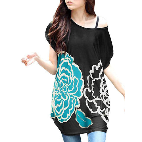 Allegra K Women Loose Fit Short Batwing Sleeve Flower Pattern Tunic Shirt
