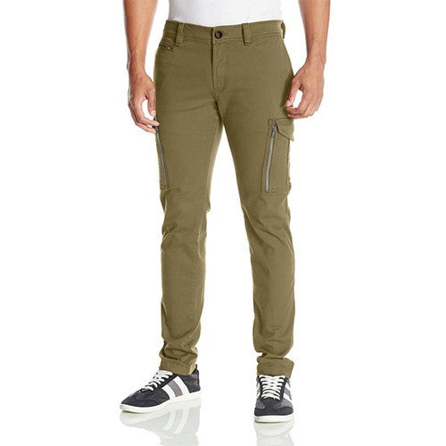 • Slim-fit pant in super-stretch cotton featuring cargo pockets with zippered sides and rear flap pockets